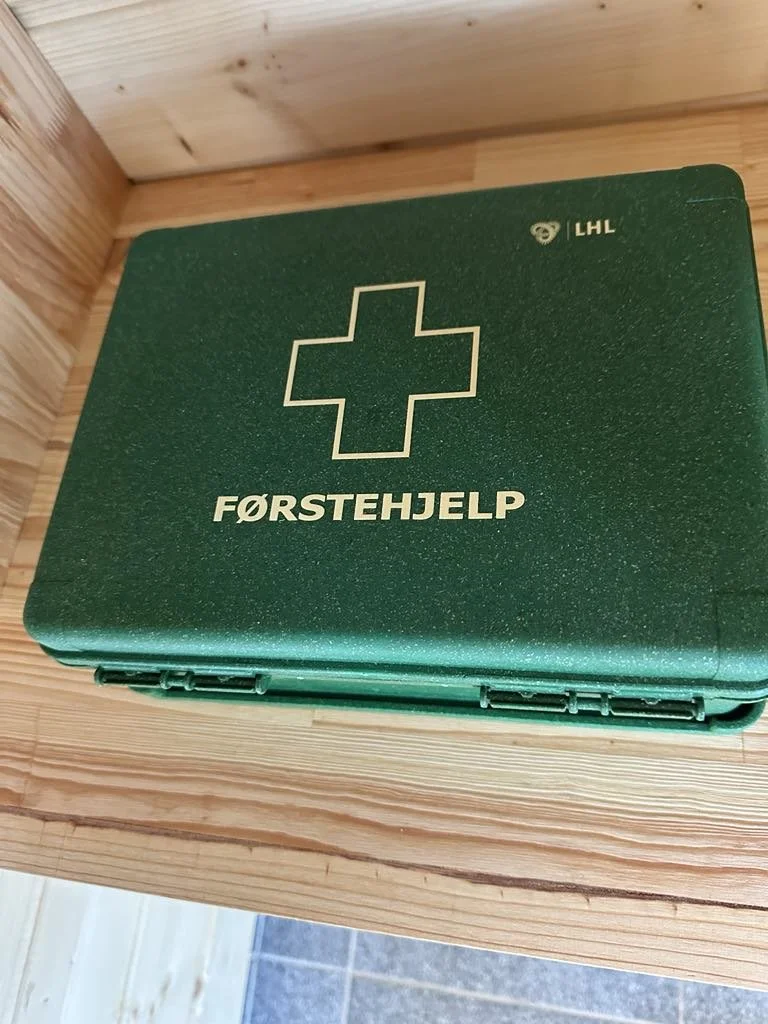 Vi har også fått førstehjelpsskrin, i tilfelle uhellet skulle være ute.