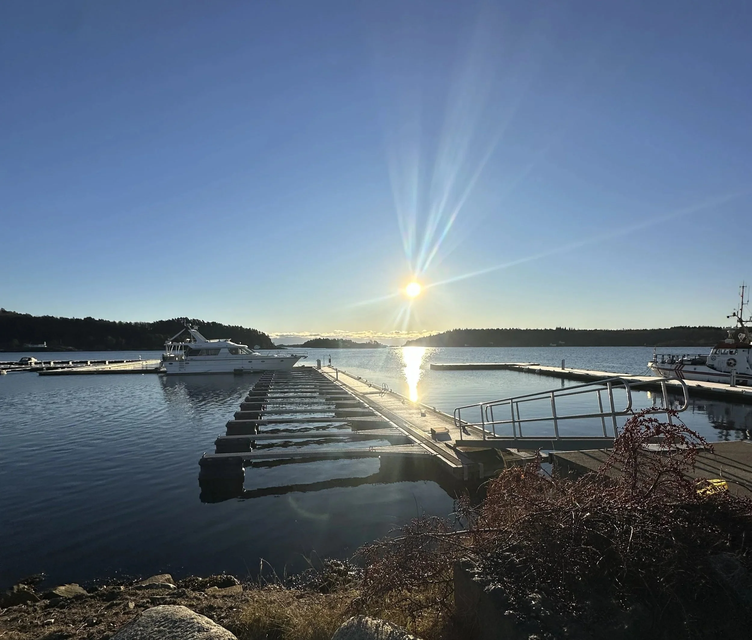 Opplyst badebrygge med trapper ned til sjøen